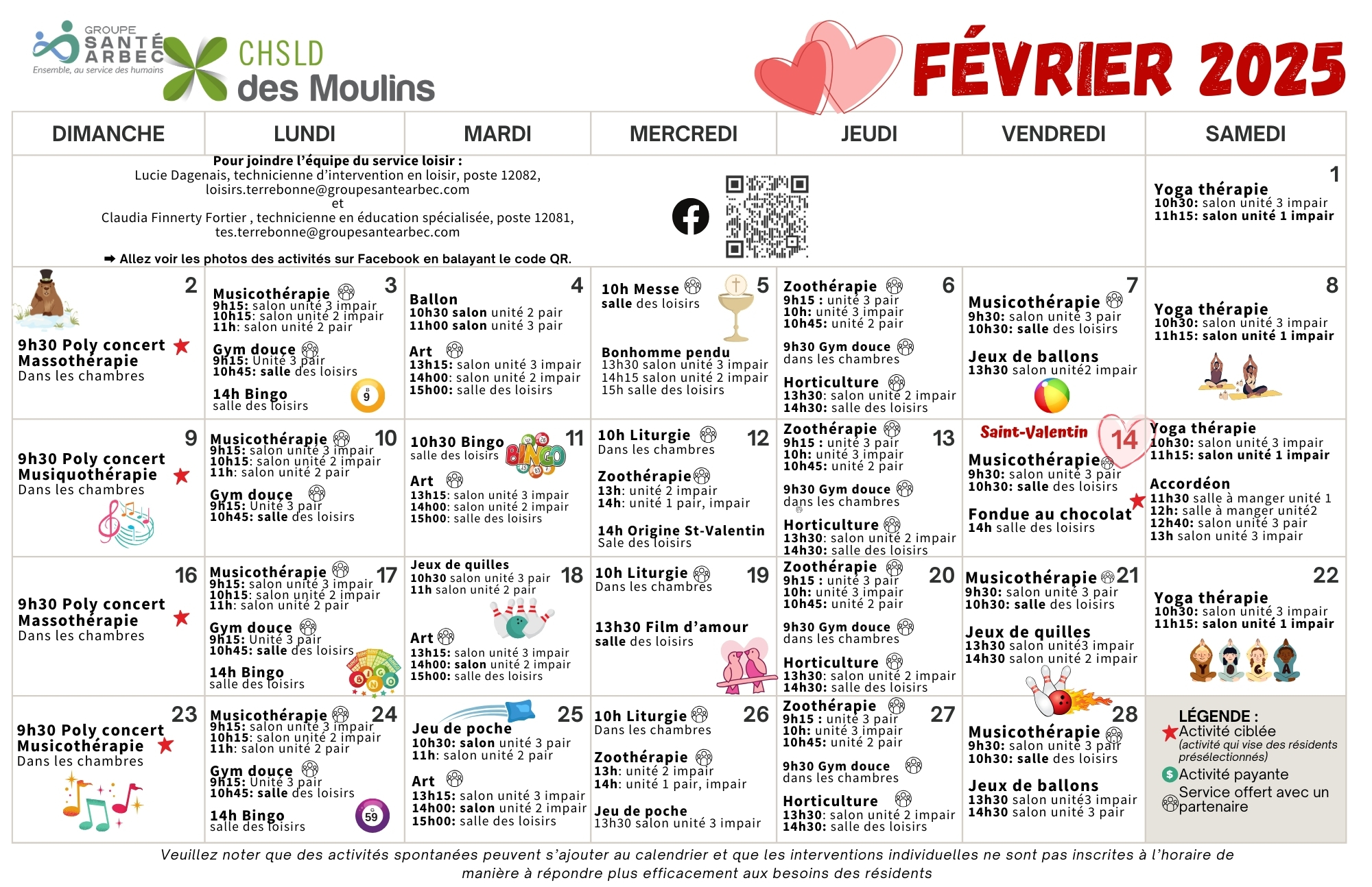 Calendrier des activités de février 2025 pour les résidents du CHSLD des Moulins