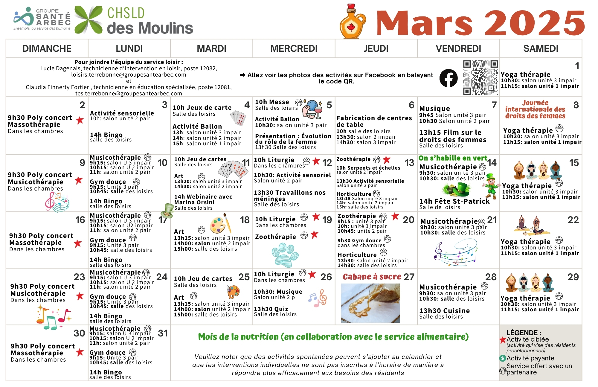 Calendrier des activités de mars 2025 pour les résidents du CHSLD des Moulins