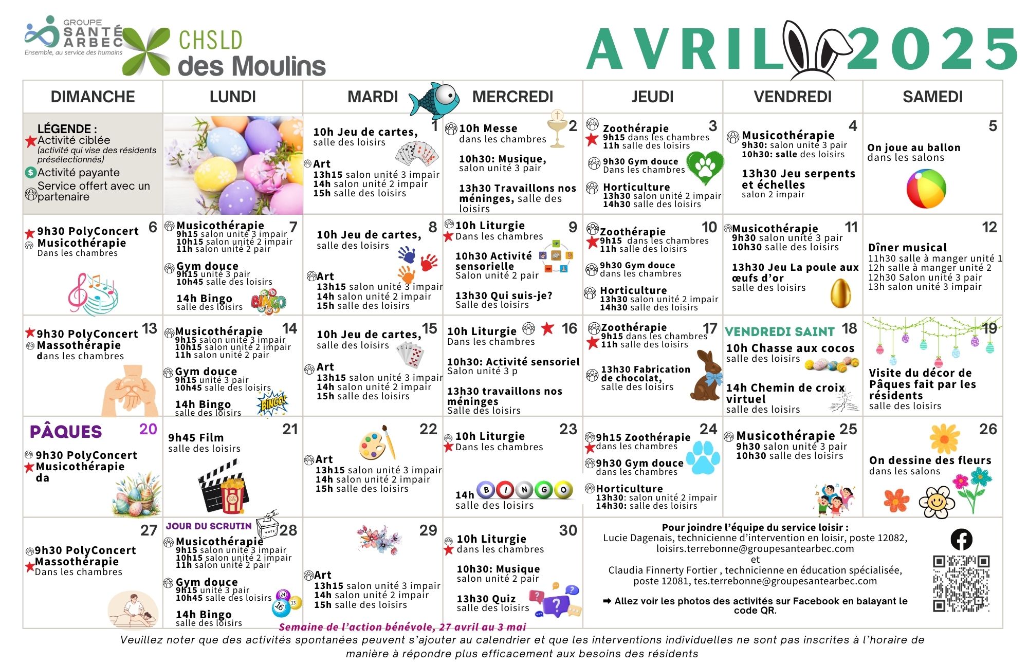 Calendrier des activités d’avril 2025 pour les résidents du CHSLD des Moulins