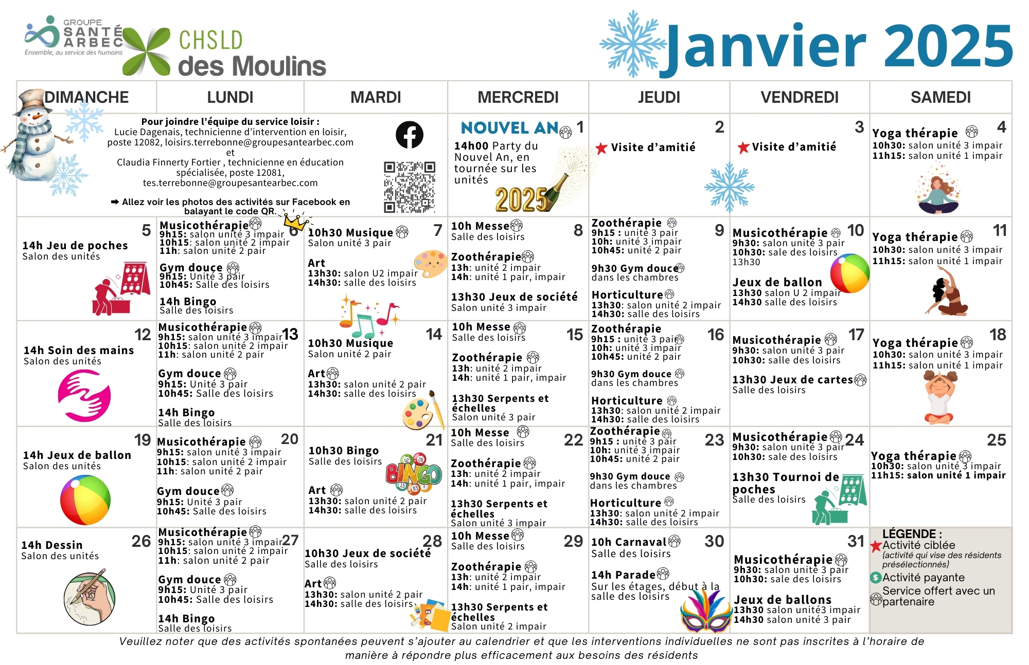 Calendrier des activités de janvier 2025 pour les résidents du CHSLD des Moulins